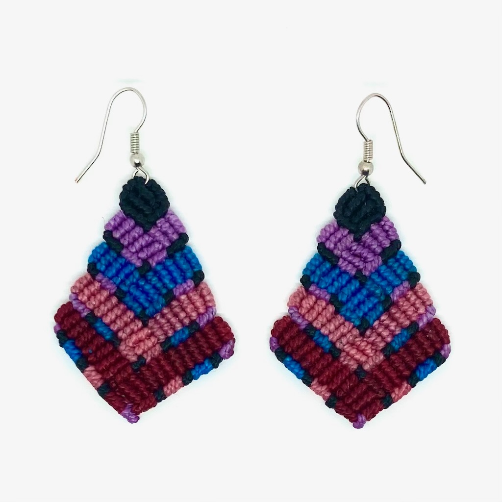 Färgglada randiga makramé-örhängen. Knutna för hand av Tilde Belloni som också står för designen.